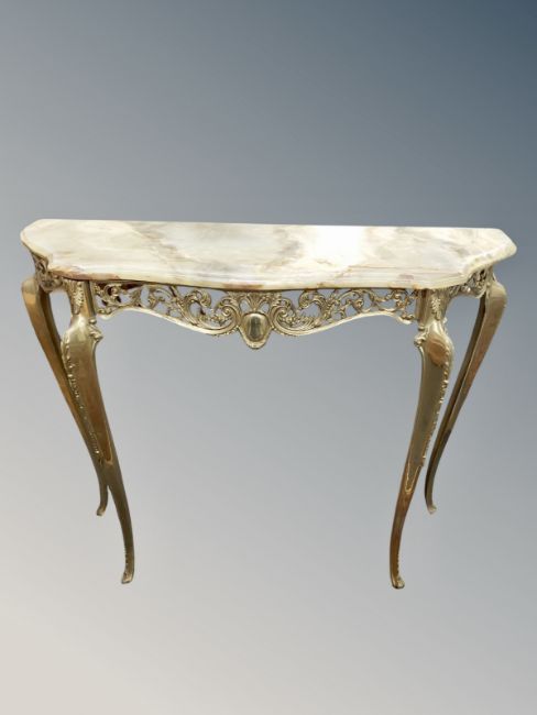 A gilt metal shaped console table with onyx top, width 110 cm
