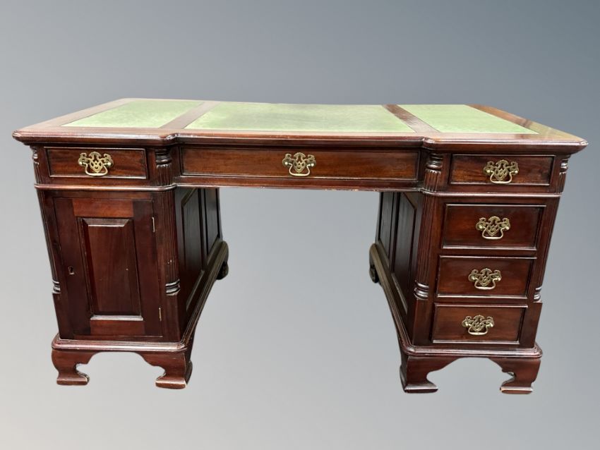 A reproduction mahogany twin pedestal writing desk fitted cupboard and drawers with three inset leather panels, width 142 cm