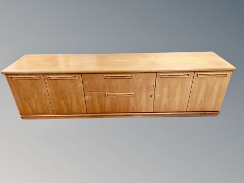 A teak G-Plan wall unit base fitted with cupboards and drawers, length 201 cm