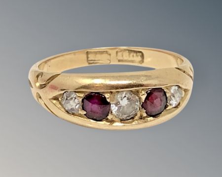 4.5g The central diamond approximately 3 mm in diameter. The diamonds are nice and white but given the nature of the setting and size it isn't possible to fully grade the stones. The two rubies are again hard to grade, they are quite dark and with minor abrasions to the surfaces. The shank is strong, looks to have been re-sized and the hallmark is rubbed.