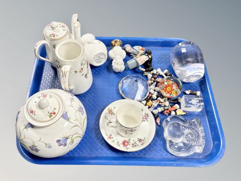 A Spode porcelain bulbous vase, Crown Staffordshire coffee can and saucer, glass paperweights, miniature porcelain figures