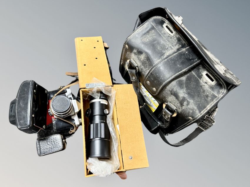 A leather camera case containing Praktica LTL camera, Soligor F=300mm lens, other camera accessories etc