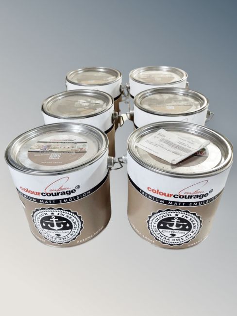 Six 2.5l tins of Colour Courage Habana Smoke matt emulsion paint