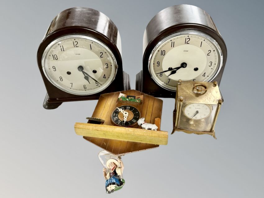 Two Bakelite cased Enfield mantel clocks together with a carriage clock and further wall clock