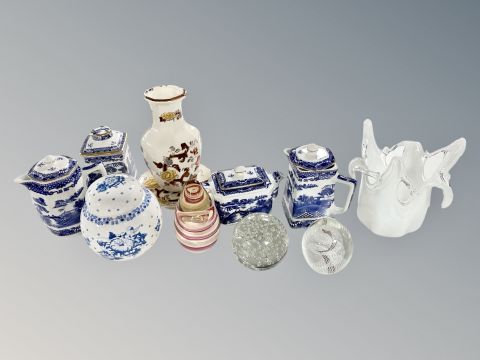 A Masons brown velvet vase and similar stand, four pieces of Ringtons willow pattern china, three glass paperweights, Ringtons caddy