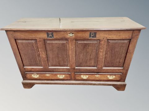 A George III panelled oak mule chest, fitted two drawers, length 150 cm