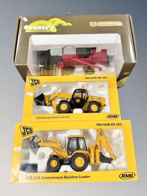 Two Joal 1:25 scale diecast JCB diggers together with a further Country collection model combine harvester, all boxed.