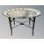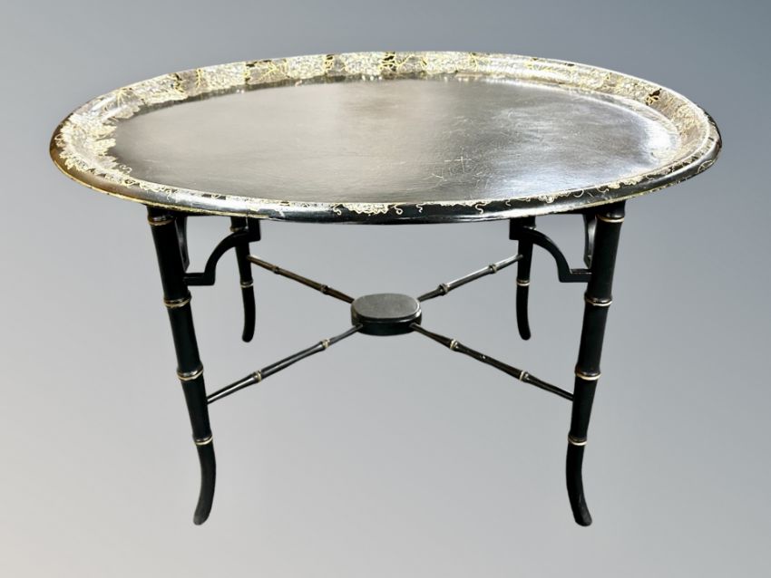A Regency style papier mache mother of pearl inlaid and gilt oval tray on bamboo effect table with X under stretcher, width 80 cm