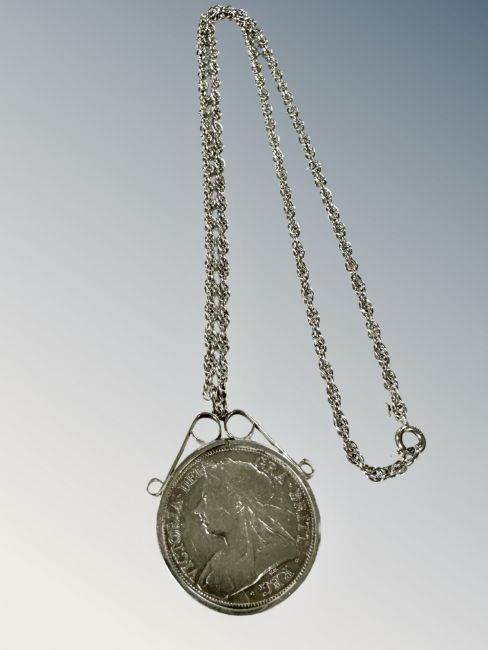 A Victorian half Crown 1893 in silver mount on chain