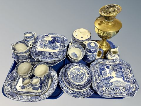 A group of English ironstone blue and white dinner ware, Copeland Spode, Masons etc, Brass oil lamp base