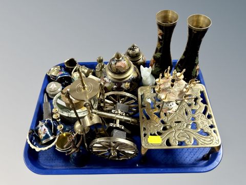 A group of metal wares, Indian enamel brass vases, miniature cannon on carriage, miniature companion set