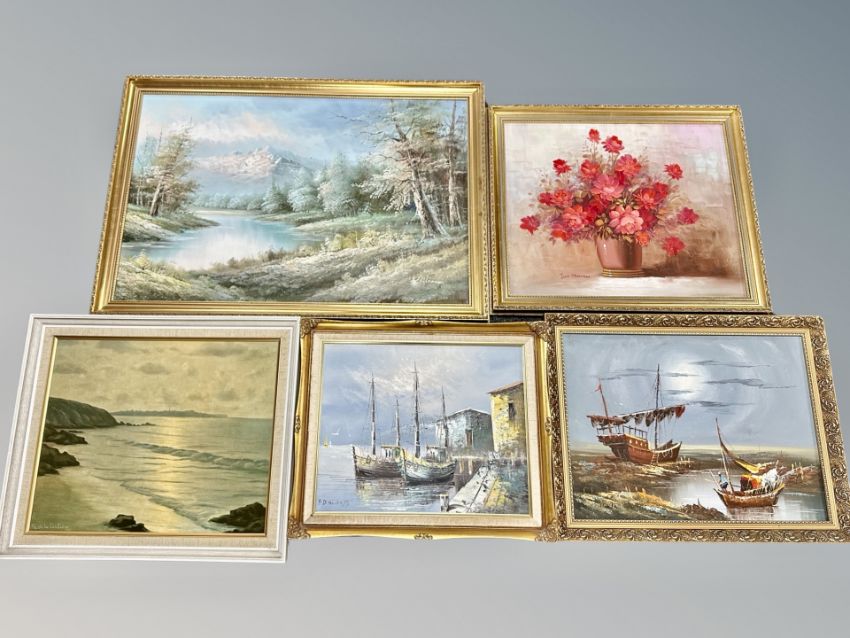 Four gilt framed oil paintings and a further print