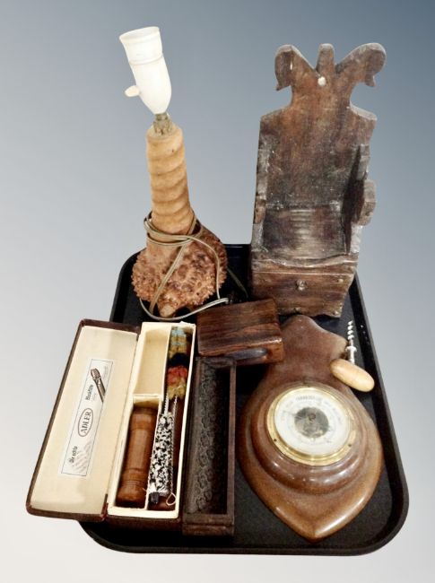 A tray of wooden table lamp base, barometer, wall shelf in the form of a throne armchair, recorder in box, wooden match vesta etc
