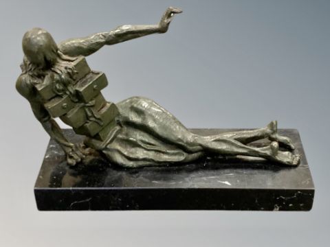 A contemporary patinated bronze sculpture on black marble plinth, length 30 cm