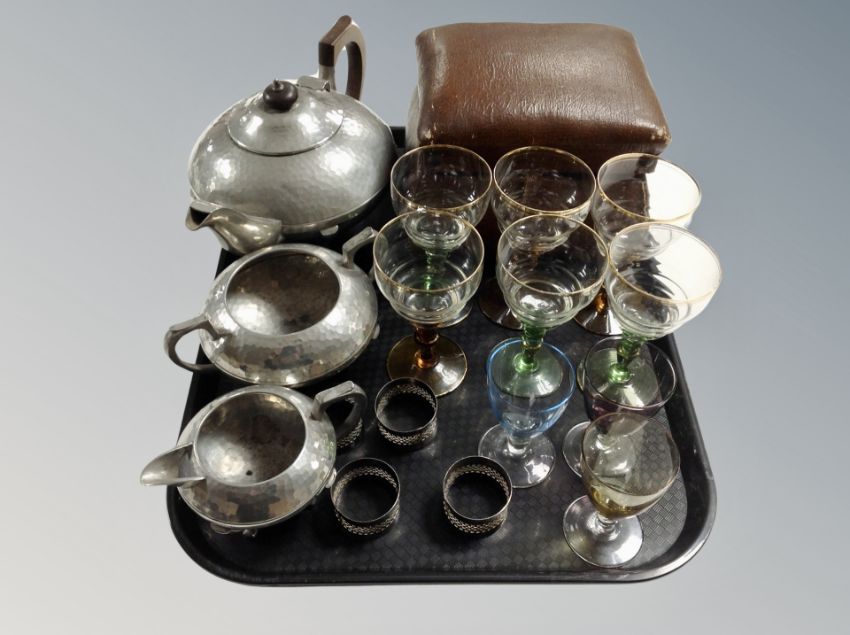 A tray of vintage miniature leather sewing box, assorted drinking glasses, three piece pewter tea service