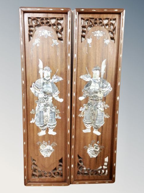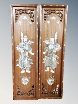A pair of Japanese hardwood and mother of pearl inlaid rectangular plaques depicting samurai warriors, length 62 cm