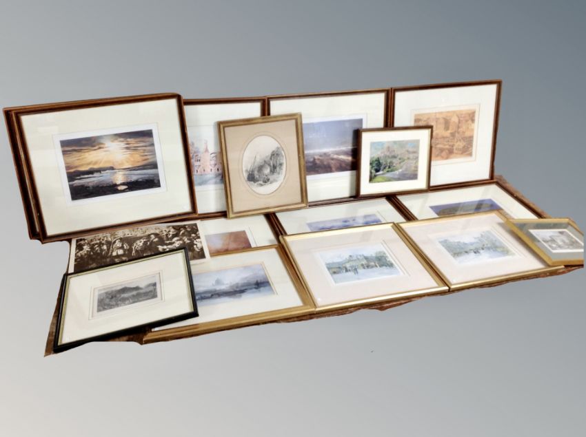 A box of pictures, prints and engravings, watercolour of Durham etc