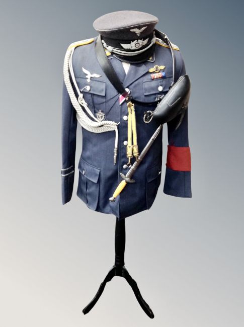 A reproduction WWII German Luftwaffe uniform with various decorations, officer's dagger and belt etc