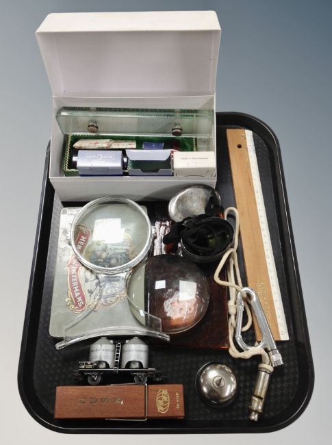 Assorted items including vintage whistle, rule, quantity of glass microscope slides, tins, Marklin railway wagon etc