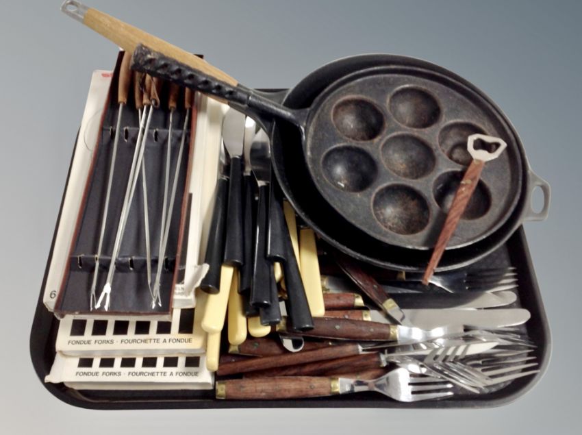 A group of Danish boxed and unboxed flatware, two cast iron skillets etc