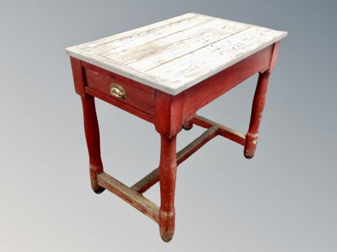 A painted limed oak WWII period War Office table on gun barrel legs, width 85 cm