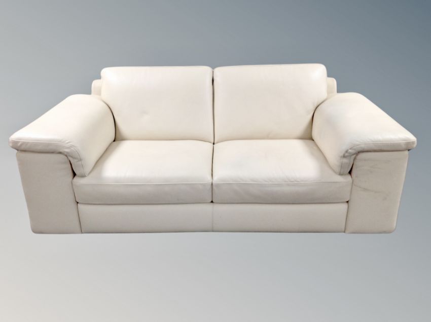 A pair of cream stitched leather three seater settees