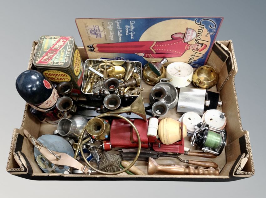 A box of enamel sign, tins, brass horn, hip flask, metal wares etc