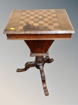 A Victorian inlaid walnut tripod sewing table with chess board top, 48 cm wide (as found)