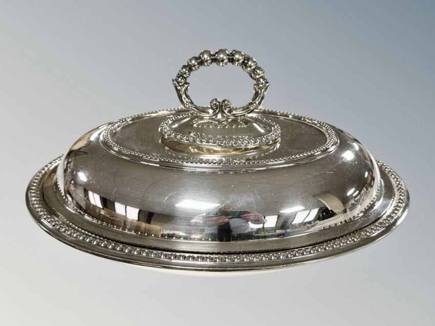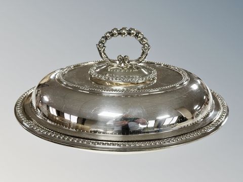 A silver plated lidded entrée dish, width 32 cm
