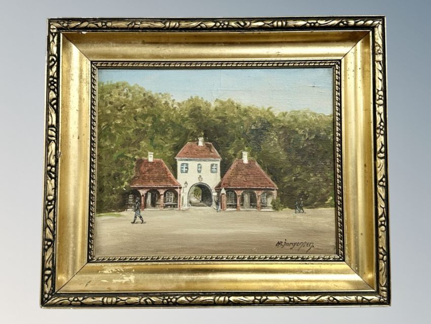 H Jorgensen : building by trees, oil on canvas, 27 cm 21 cm