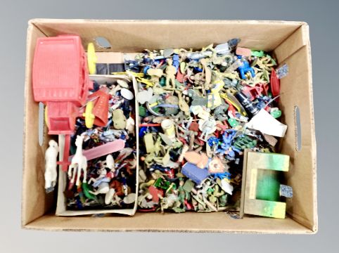 A quantity of die cast and plastic soldier figures, cars, horses and carriage etc