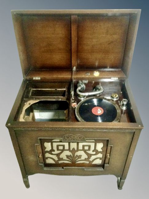 A Geisha gramophone in oak cabinet and a box containing assorted 78's