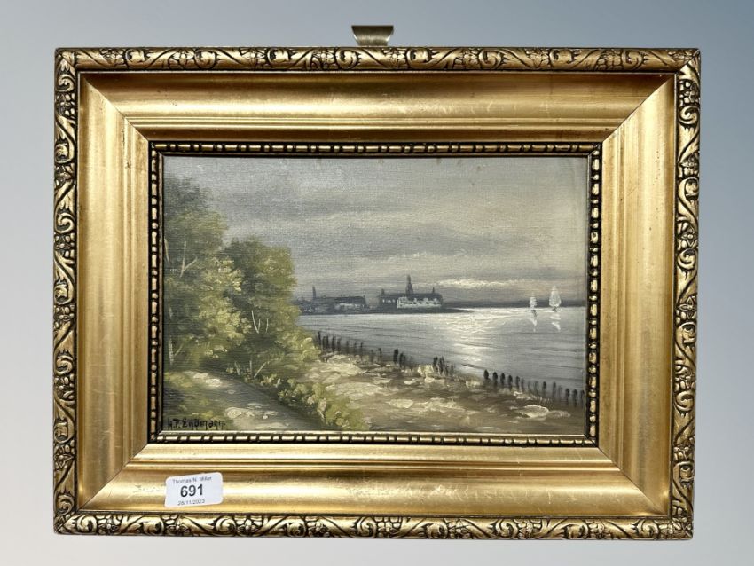 H Enbinann : moonlight over river, oil on canvas, 28 cm x 19 cm