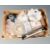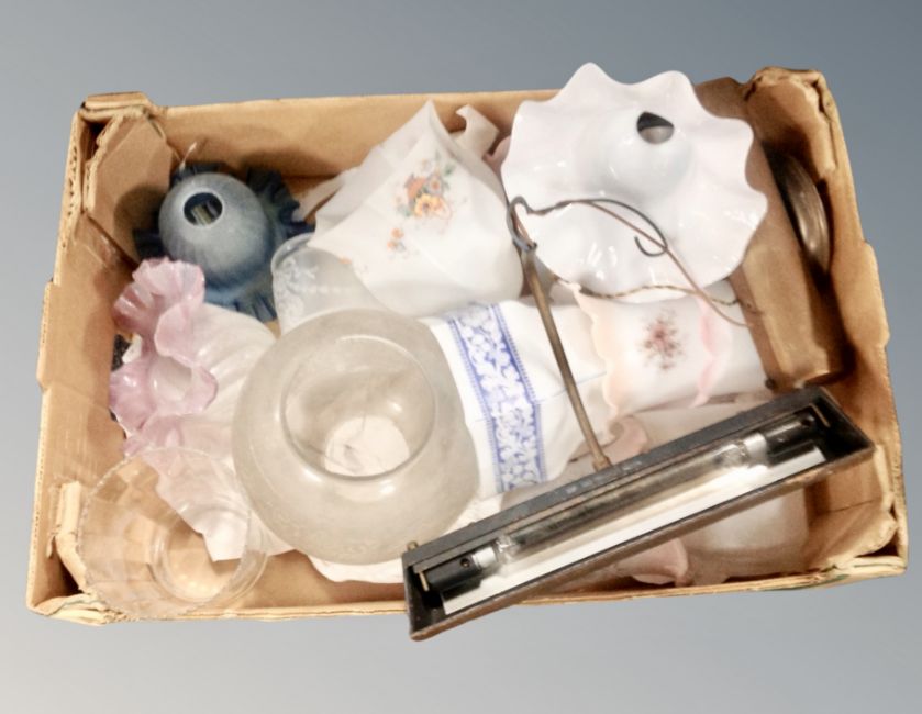Two boxes of metal wares, toasting forks, plated trophy, brass trivets, two quartz time pieces, various clear and opaque glass light shades etc