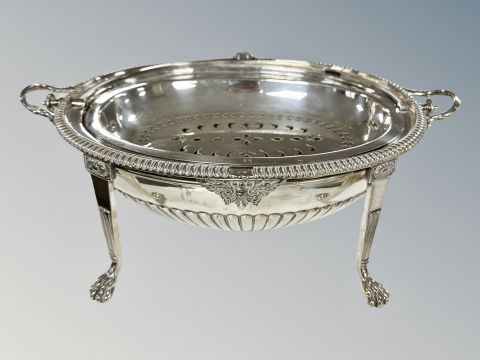 A good quality silver plated dome top entrée dish on paw feet, width 35 cm