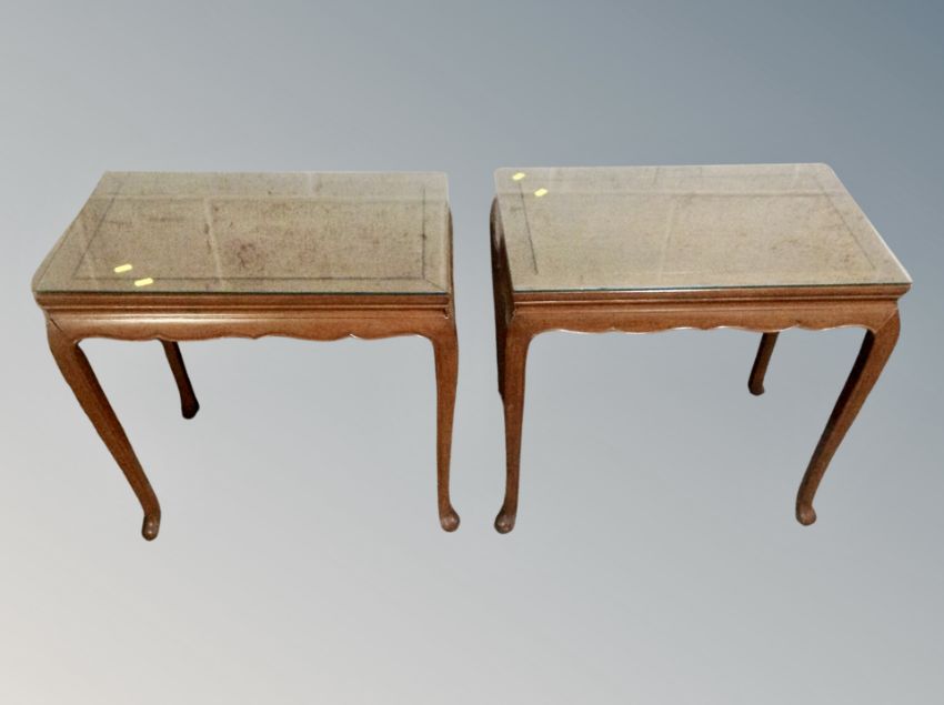 A pair of reproduction mahogany lamp tables on cabriole legs with plate glass tops, width 61 cm