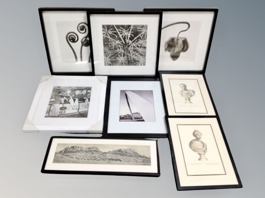 Eight contemporary framed pictures including Gateshead millenium bridge, topographical landscape, still life etc