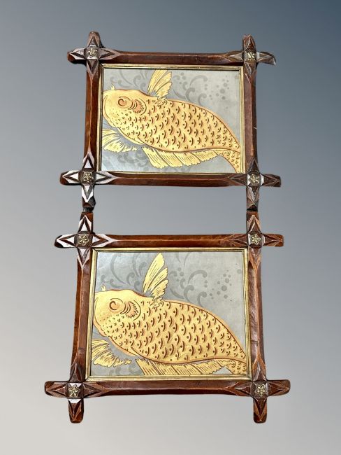A pair of 19th century carved pine cruciform frames with panels depicting Koi fish, each 42 cm x 36 cm