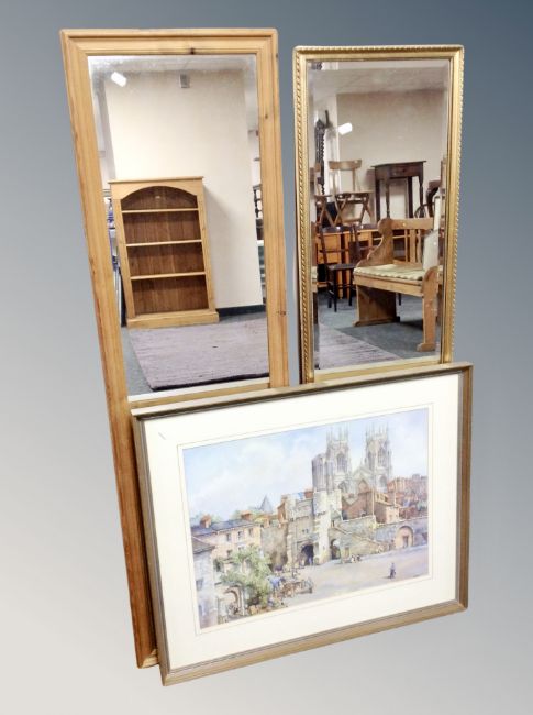 A gilt framed rectangular mirror, further pine mirror, print after Sturgeon