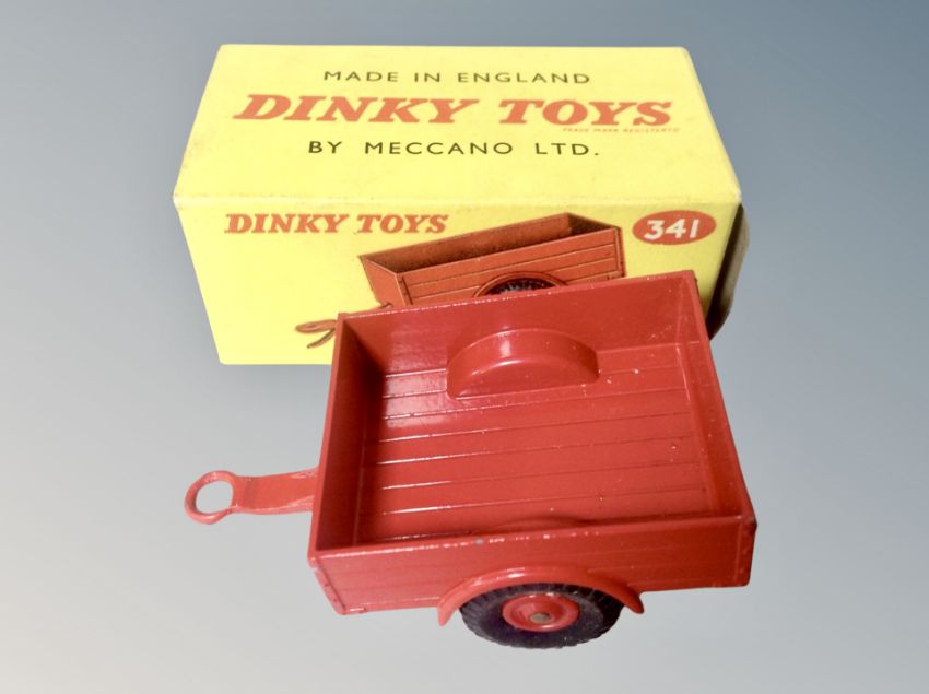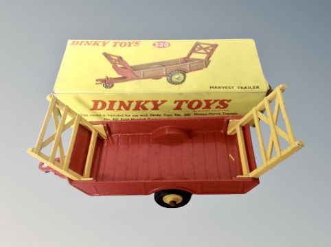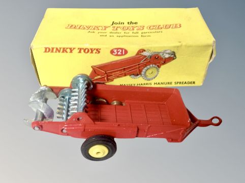 Dinky Toys - Massey Harris Manure spreader 321, Land-Rover Trailer 341 and Harvest Trailer 320, all parts boxed. (3)