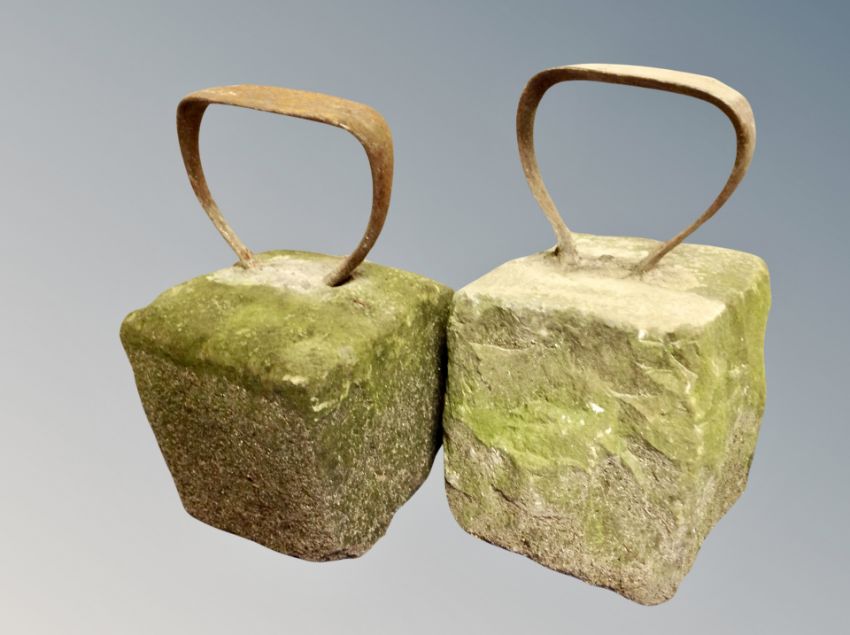 Two weathered stone and cast iron boot scrapers, height 27 cm