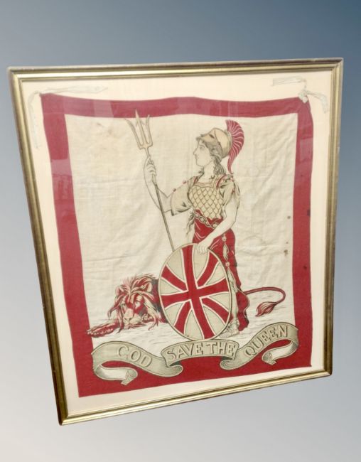 An antique God Save the Queen banner in gilt frame, 102cm by 92cm overall