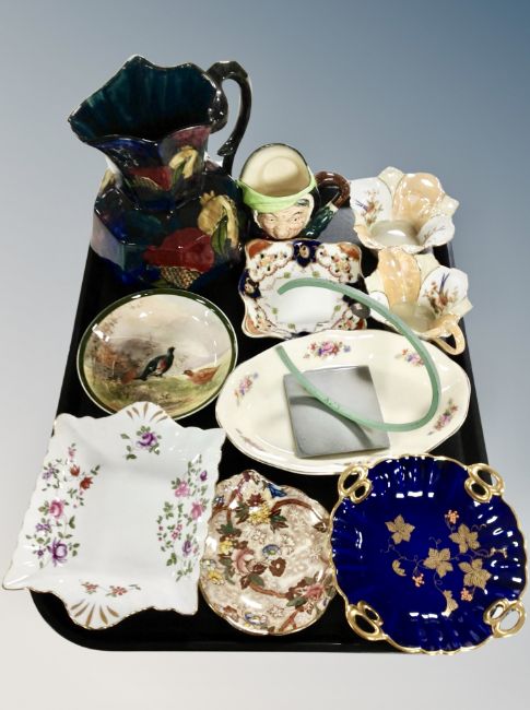 A Rubens ware pomegranate pattern lustre jug, other ceramics, miniature Royal Doulton character jug, plates including Royal Doulton, Staffordshire, Maling chintz etc