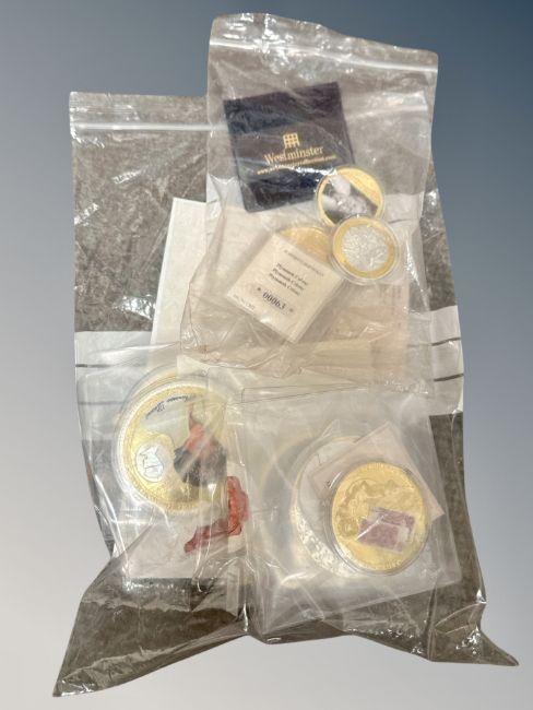 An inventory of coins - Windsor Mint proof limited edition gold-layered Diana coins set with Swarovski crystals, Windsor Mint gold plated Queen Elizabeth proof banknote coins, Windsor Mint banknotes of the Armed Forces, Windsor Mint The Queen's Platinum jubilee limited edition set, Windsor Mint gold plated proof Coronation coins portraits of the Queen, Windsor Mint Ships of the Royal Navy, Windsor Mint 2003 limited edition Concord set, Windsor Mint Golden Jubilee proof 1952 editions, Windsor Mint British Banknote commemorative strike, Windsor Mint British Banknote commemorative set, Jubilee Mint 24ct gold plated photographic £5 coin collection, Windsor Mint Historic Battles of Our Time, Windsor Mint Poppy Quarter Canada 2008, Windsor Mint limited edition proof 50 years of decimalisation, Windsor Mint 1936 year of the Three Kings, London Mint The Official Elvis Presley gold layered coin collection (one missing), Windsor Mint medallion Commemorating St. George and the Dragon, Windsor Mint medallion Diana 'A Legend', Ten further loose commemorative coins issued by Windsor Mint - Prime Minister Churchill, Armistice centenary etc. Nearly all parts cased and with certifications.