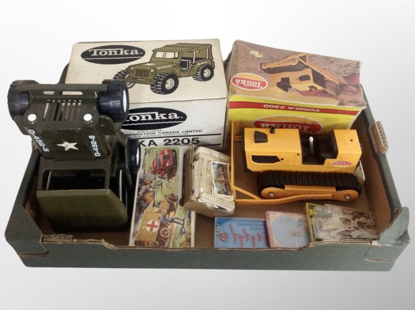 A box of Tonka jeep, boxed bulldozer model, box of cigarette cards, Airfix RAF emergency set modelling kit in box