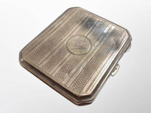 A silver cigarette case with engine turned decoration
