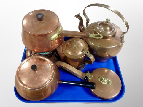 A group of copper kitchenalia including teak-handled pan on burner, further long-handled pan, kettle, tankard etc