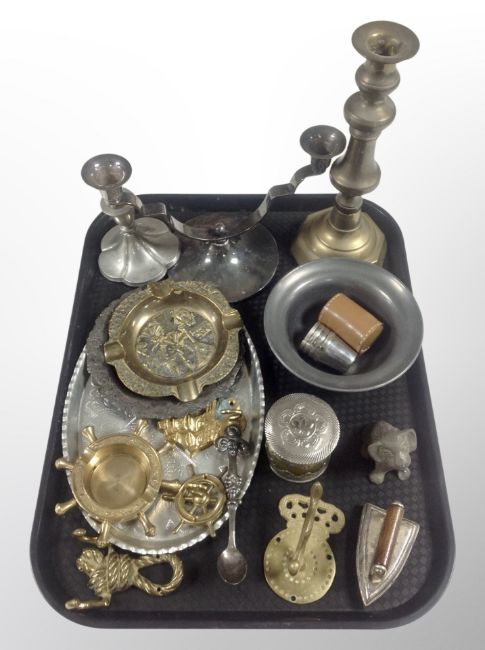 A group of metal wares, table candelabrum, candlesticks, miniature tots in leather case etc