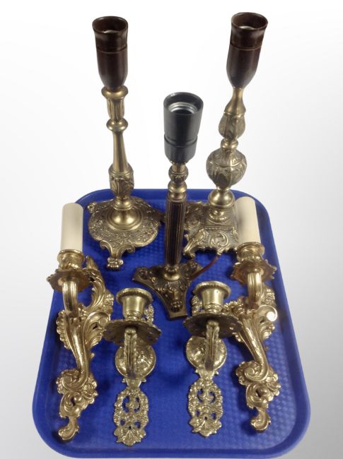 Two pairs of gilt brass wall sconces, (larger pair wired), together with three ornate lamp bases