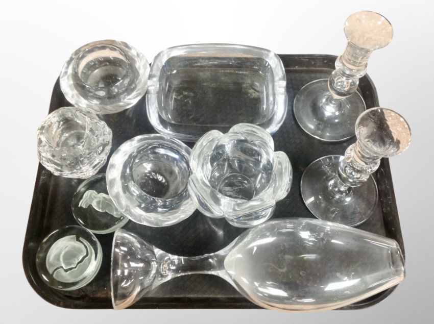 A group of Danish glass ware, pair of candlesticks, paperweights, vase, tea light holder etc